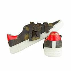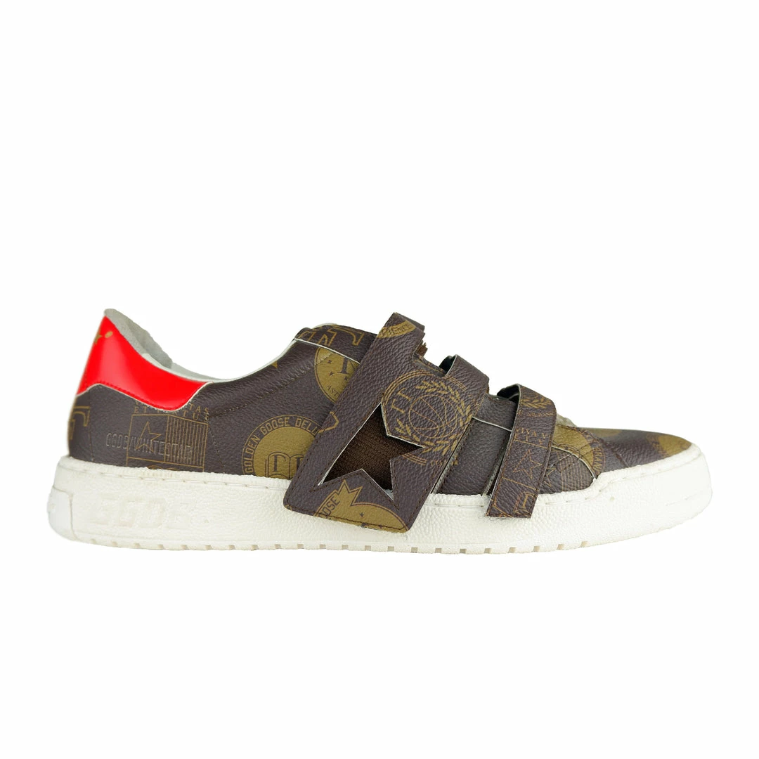 Golden Goose sneakers da uomo in pelle di vitello marrone con stampe logo, chiusure a lacci a strappo con velcro, copntrafforte del tallone in pelle verniciata rossa, 100% pelle, suola in gomma.