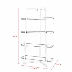 - PRODUCT DIMENSION – Overall – 39.4″L x 19.7″W x 69″H. Top shelf – 39.4″W x 8.7″D x 1.6″H; 2nd shelf from top – 39.4″W x 9.4″D x 1.6″ H; 3rd shelf from top – 39.4″W x 10.8″D x 1.6″H; Bottom shelf – 39.4″W x 10.7″D x 1.6″H.