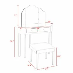 - DIMENSIONS – Vanity – 28″L x 28″W x 30.7″H; Stool – 17.7”L x 14.9”W x 16.9”H; Drawers interior – 10”W x 9.1”D x 3.3”H. Mirror 20.9″H, 32.3″L – fully expanded, 16.1″L – closed.