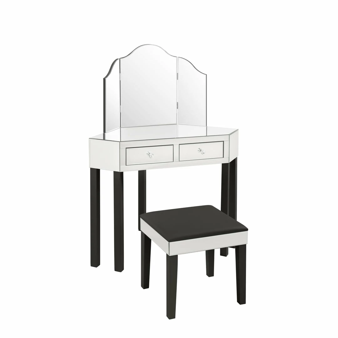 Our chic mirrored vanity set/desk brings classic glamour to your room. This elegant furniture set is great for storing jewelry, cosmetics and makeup brushes. The stylish, contemporary design features two storage drawers with crystal knobs and a smooth mirrored tabletop. This vanity table is complete with matching stool built with a padded upholstered seat and a tabletop vanity mirror. Pair it with equally antiqued decor or make it modern with contemporary accents. This elegant set is a timeless classic offering sophistication while constructed and designed with modern principles and materials. Tri-Fold Mirror design easy for take away and daily maintenance, can open or fold it like a book when not using to protect it away from the dust or other scratches.