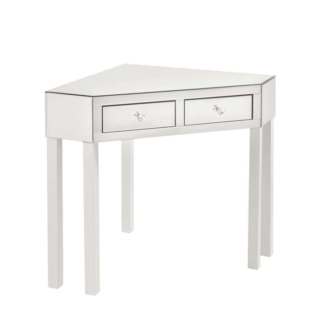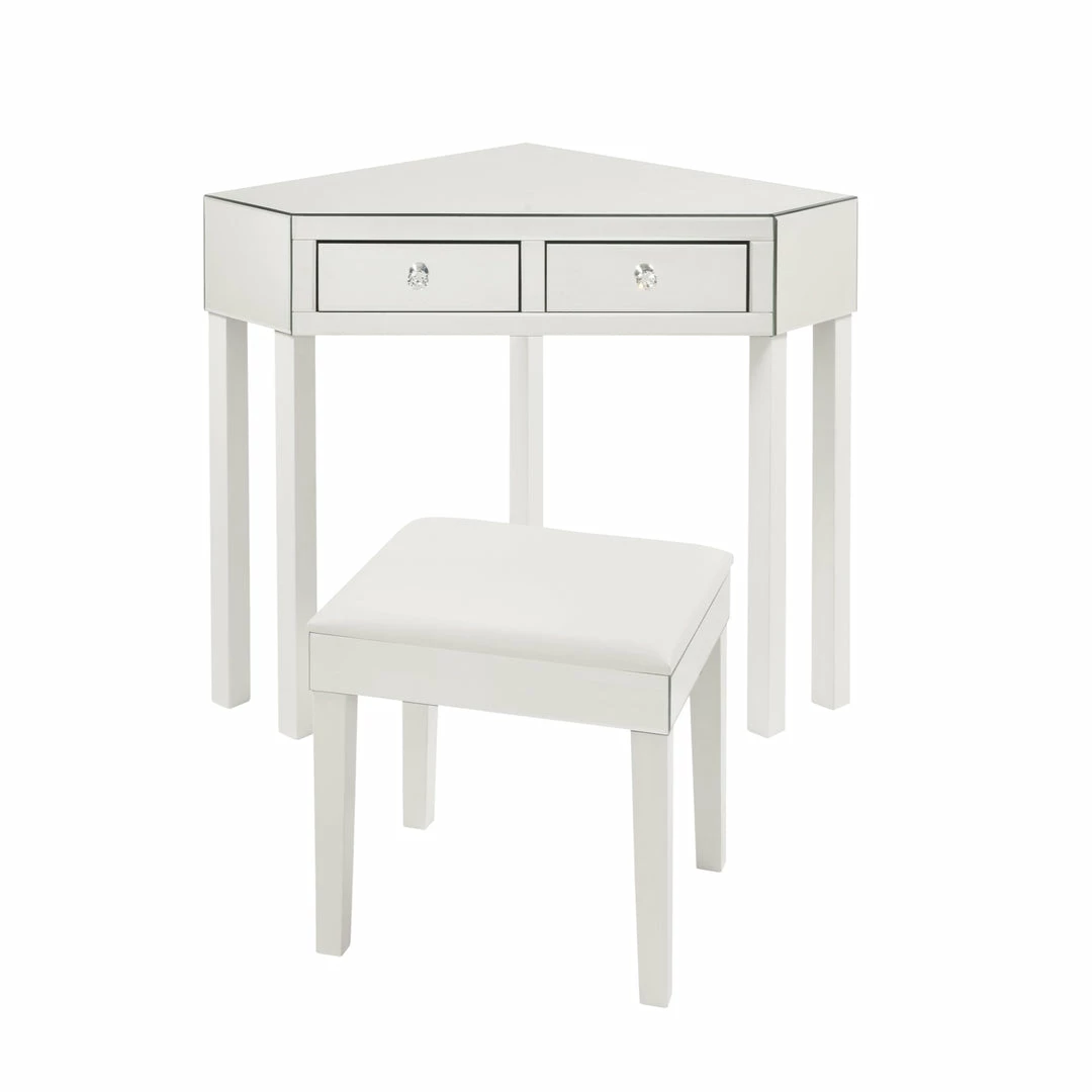 Our chic mirrored vanity set/desk brings classic glamour to your room. This elegant furniture set is great for storing jewelry, cosmetics and makeup brushes. The stylish, contemporary design features two storage drawers with crystal knobs and a smooth mirrored tabletop. Matching chair makes it a complete set! The triangle mirrored top surface could also be a perfect display for a lovely floral arrangement, lamp, or family photos.