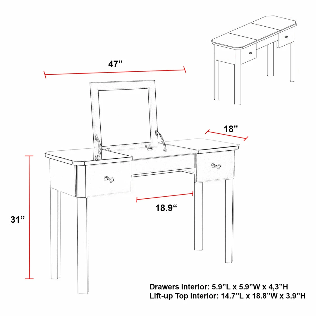 - DIMENSIONS – Vanity – 47″L x 18″W x 31″H; Drawers interior – 5.9″L x 5.9″L x 4.3″H; Lift-Up Top Interior – 14.7″L x 18.8″W x 3.9″H
