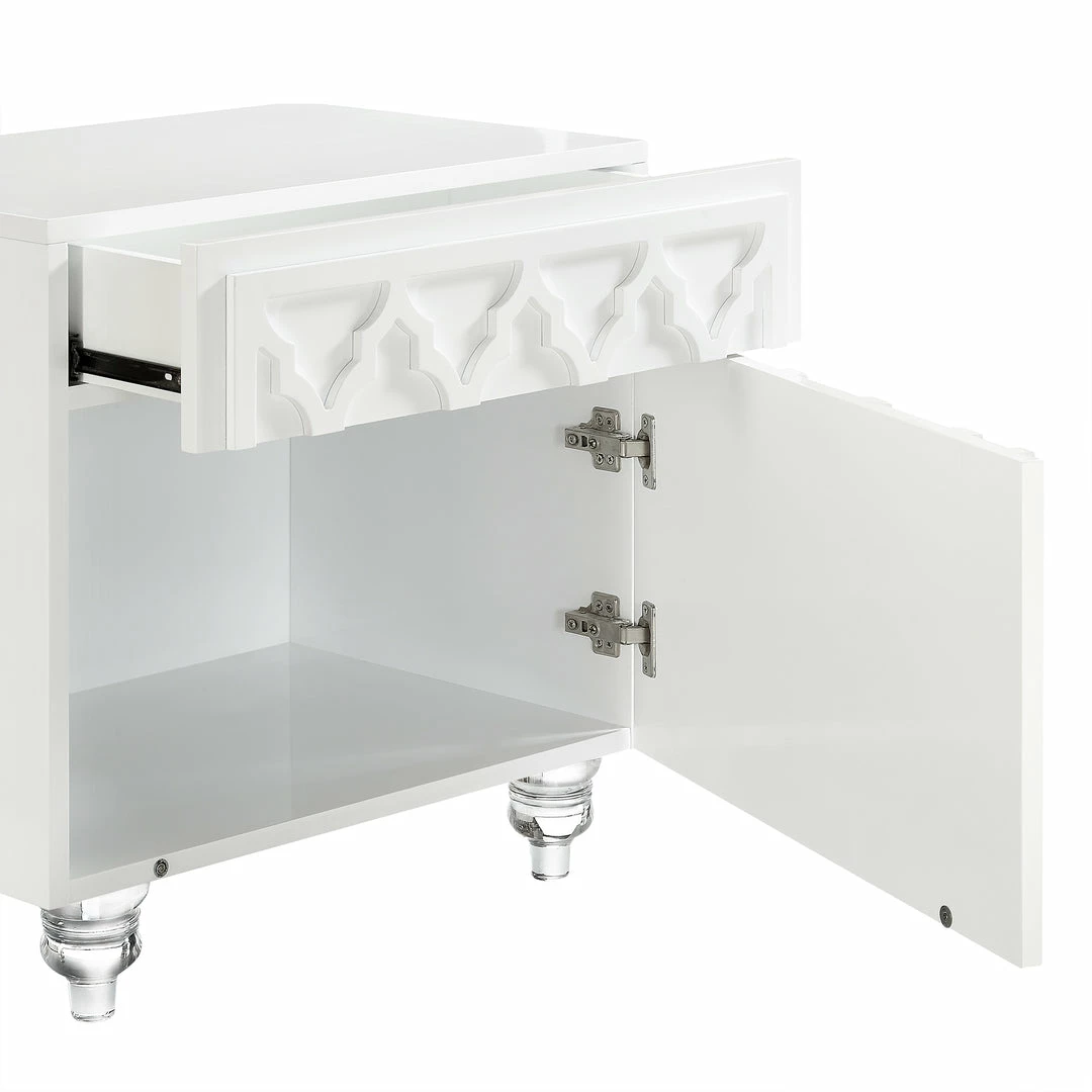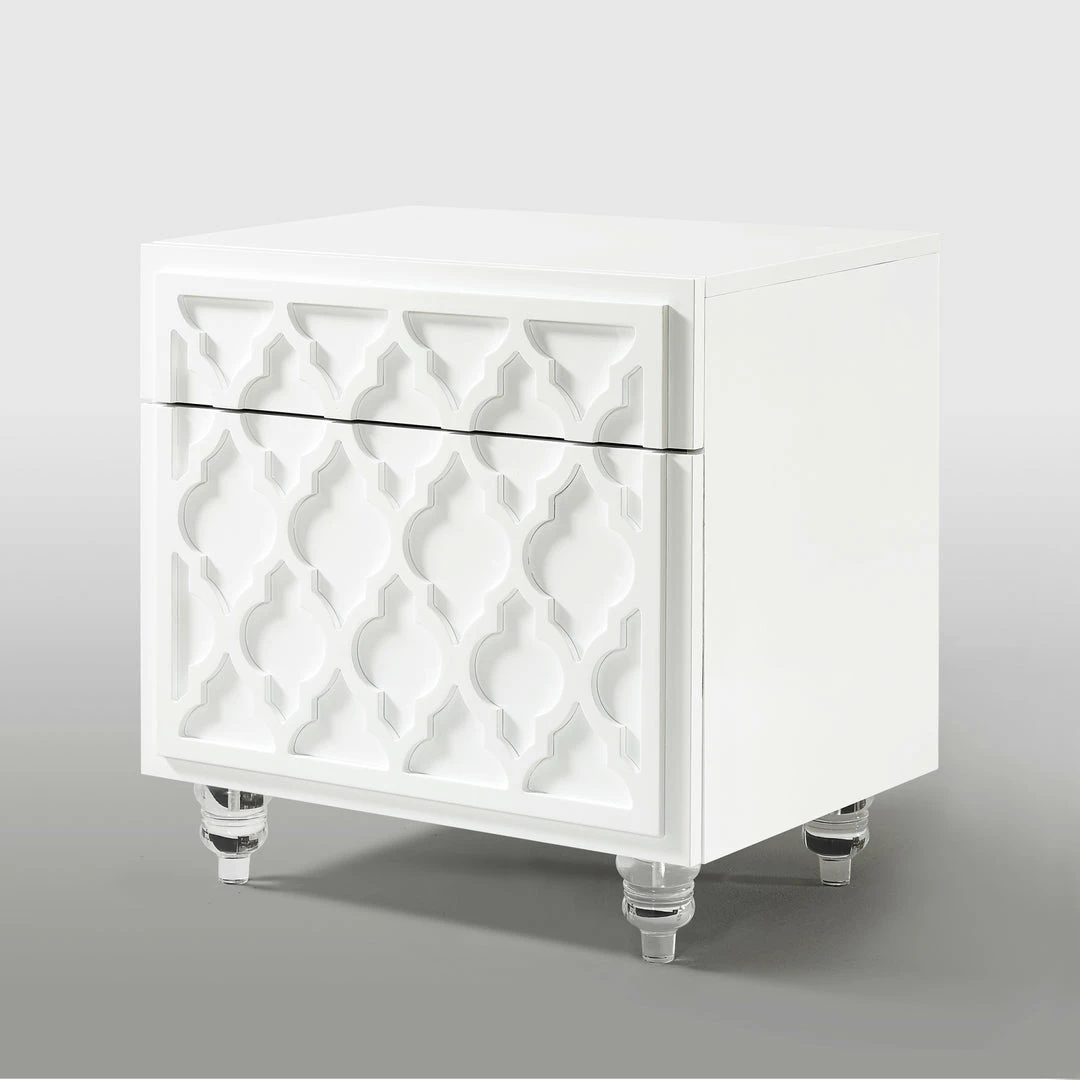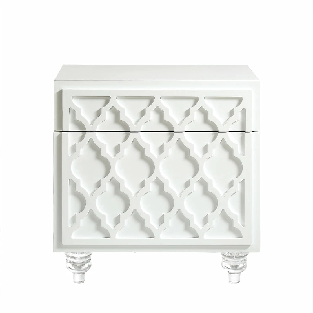 - ATTRIBUTES – Trellis Lacquer-Finish, Lucite Leg,