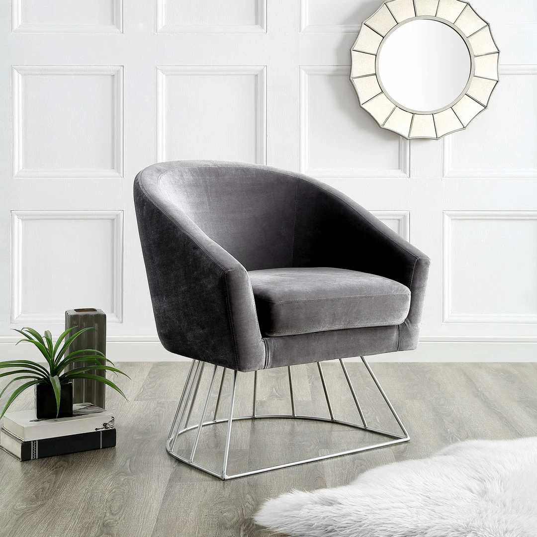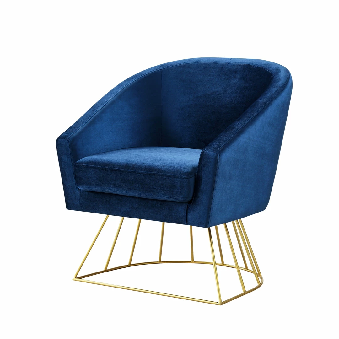 Functional, versatile and beautiful accent chair is the perfect addition to any space. It will spice up any living environment with qualities of sophistication, class and taste. Soft angles and unique curved metal base design come together in a seat that is smartly aesthetic and ready to grace your cozy living room. Featuring buttery soft velvet upholstery and high density foam cushioned seat, this elegant accent piece provides both functionality and a focal point of color and style that seamlessly blend harmoniously with your main furniture to create a dynamic and cozy interior space to come home to