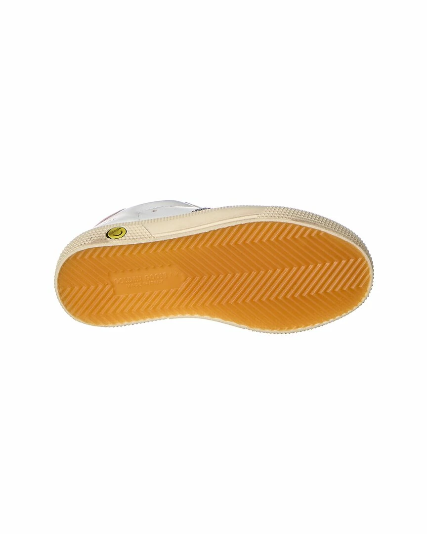 - May Leather Sneaker In White And Red Leather With Distressed Design, Camo Star Accent And Printed Laces