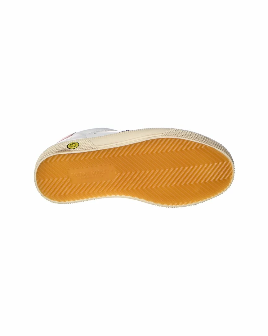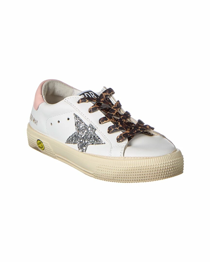 - May Leather Sneaker In White And Pink Leather With Distressed Design, Glitter Star Accent And Printed Laces