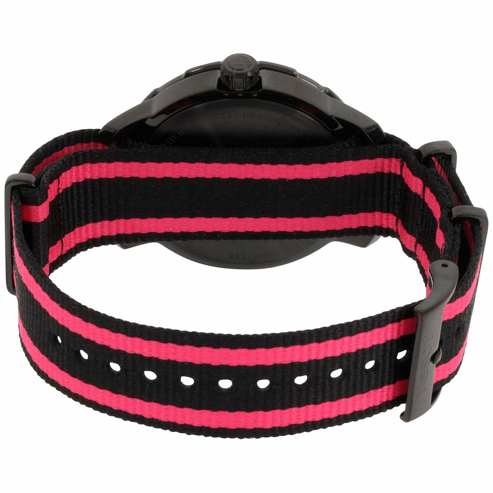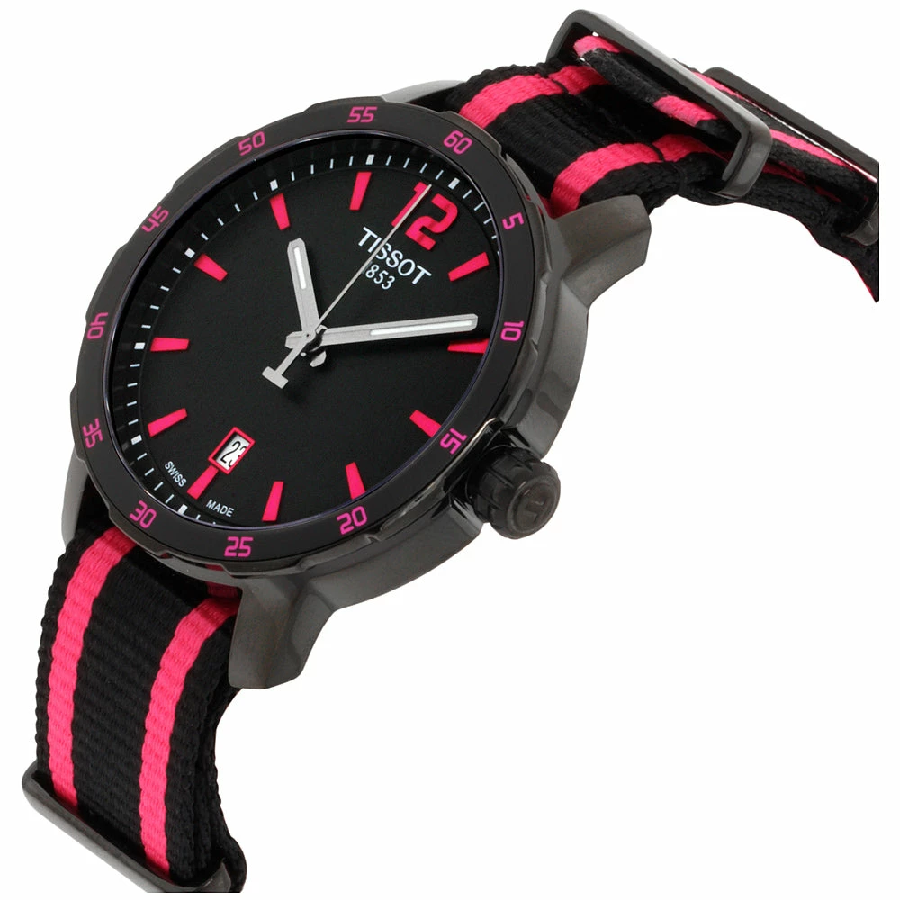 The Tissot Quickster unisex quartz watch is a classic timepiece crafted in Switzerland. With a black PVD stainless steel case, the watch is 40 mm in size and features scratch-resistant sapphire crystal with a closed back for added protection from water up to 100 m (330 feet). The dial color is sleek black, while the band is an elegant two tone nylon strap secured by a pin buckle clasp. Additionally, it has pull and push crown movement as well as date display at 6 o’clock making this piece fashionable yet functional. (T0992071111600)