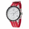 The case is made of durable Stainless Steel. The case width is 42mm and the dial is protected by a Sapphire Crystal Scratch Resistant. It’s water resistant up to 100 m (330 feet). The Strap is White Nylon and the dial is Silver. The movement is Quartz.
