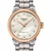 The Tissot Chemin des Tourelles men’s automatic watch can be your perfect accessory for any occasion. Its Swiss-made Powermatic 80 movement with pull and push crown, along with a power reserve of 80 hours, ensures reliable performance. The round case is constructed of stainless steel and features scratch-resistant sapphire crystal and an exhibition back; at 42.9 mm in size it’s sure to make a statement wherever you wear it. The silver dial has the date displayed at 6 o’clock, while the band is composed of both silver and rose gold stainless steel bracelet secured by a deployment clasp closure. With 50 m (165 feet) water resistance this watch can even be worn in light aquatic activities – making it truly versatile! (T0994073603700)