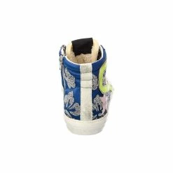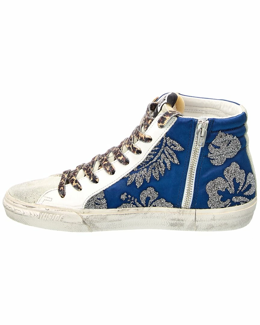- Slide Satin & Leather Sneaker In Blue Satin And White Leather And Suede And Silver-Tone Hardware With Bead Embellishments, Printed Laces And Zipper Accent