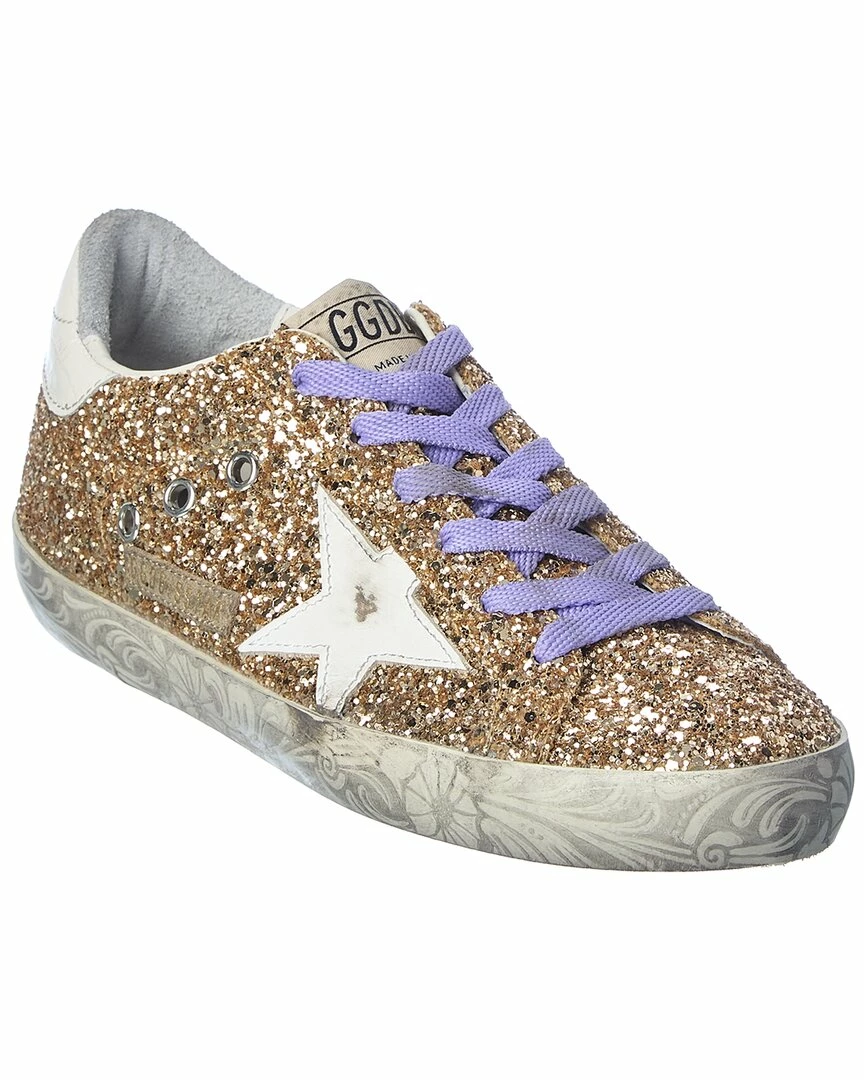 - Superstar Glitter & Leather Sneaker In Gold Glitter And Leather And Silver-Tone Hardware With Distressed Design And Contrast Laces